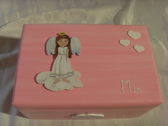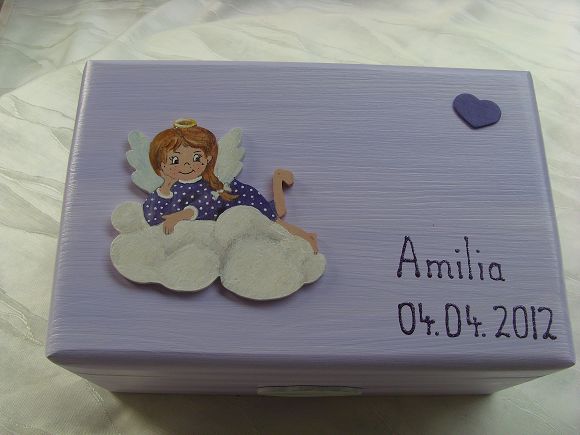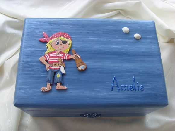| Schatzkisten oder Aufbewahrungsboxen, auf Wunsch individuell gestaltet. - für Kinder ein tolles Geburtstagsgeschenk, mit Namen des Kindes beschriftet (perfektes Versteck für kleine oder größere Geheimnisse), hübsche Dekoration für jedes Kinderzimmer - als Aufbewahrungsbox in der Küche oder im Bad - zur Geburt, ein Willkommensgeschenk für den neuen Erdenbürger - zur Taufe (Aufbewahrung für die ersten Babysachen, wie z.B. der erste Schnuller, die ersten Schuhe .....) - Zusätzlich kann eine Einlage mit 4 Unterteilungen geliefert werden, darin lassen sich Kleinigkeiten bestens aufbewahren Können mit einer Schließvorrichtung geliefert werden. Maße: 30 x 20 x 15 cm (BxTxH) (zum Vergrößeren bitte auf die Bilder klicken)